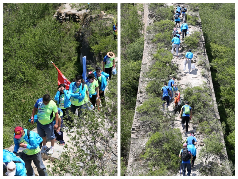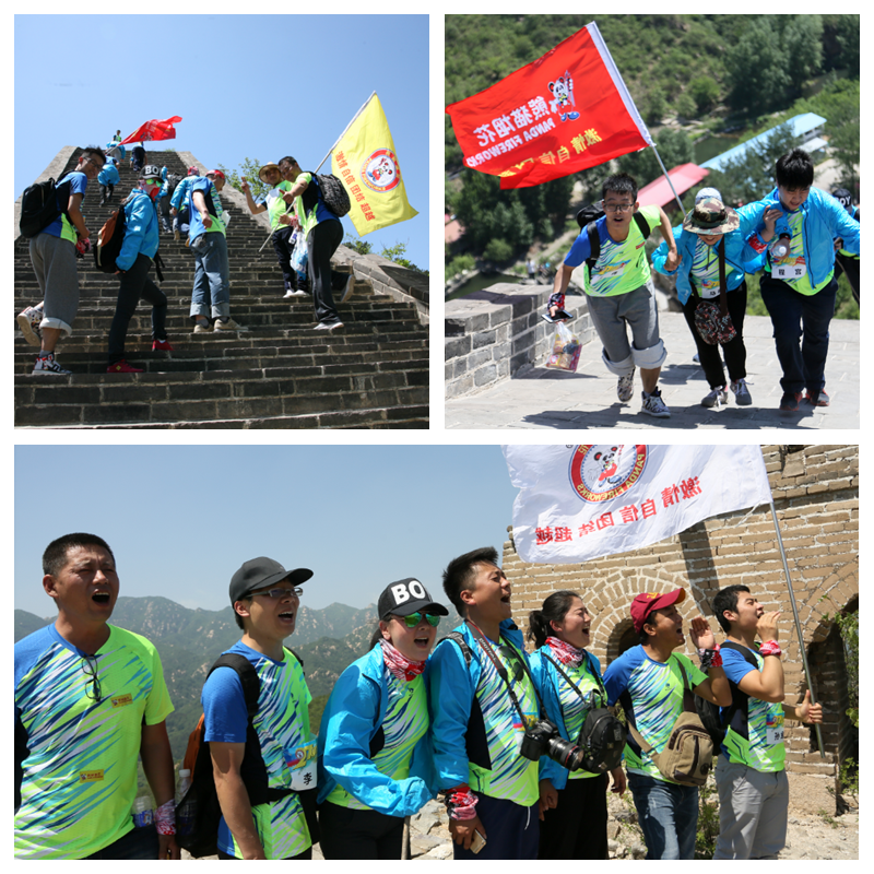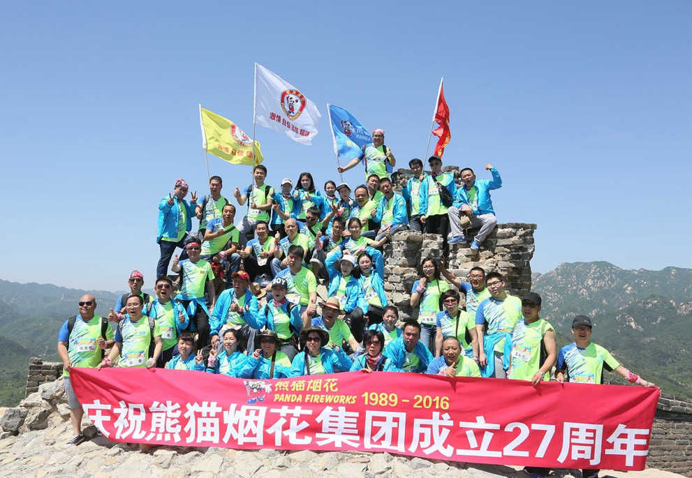 在一片欢歌笑语声中,我们来到了撞到口长城脚下,“未登长城,先登台阶”当我们对长城失去希望的那一时刻,走在前面的同事告诉我们,“快上来,长城上面的路很平坦”,听到这一个消息,我们落在后面的几个同事,一鼓作气登上了万里长城第一个烽火台。冲在最前面的同事舞动着熊猫烟花的旗帜,为我们加油呐喊。看着移动的熊猫烟花旗帜登上了一个又一个的烽火台,让我们不由想起熊猫烟花走过的一个又一个年头。在这幸福的时刻,我们每个人都战胜了自己,登上了长城的最高峰,在长城上留下了我们熊猫烟花这个大家庭的全家福。